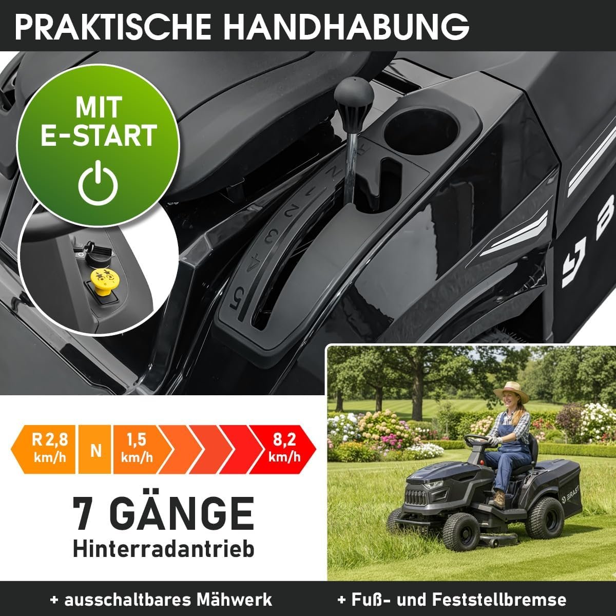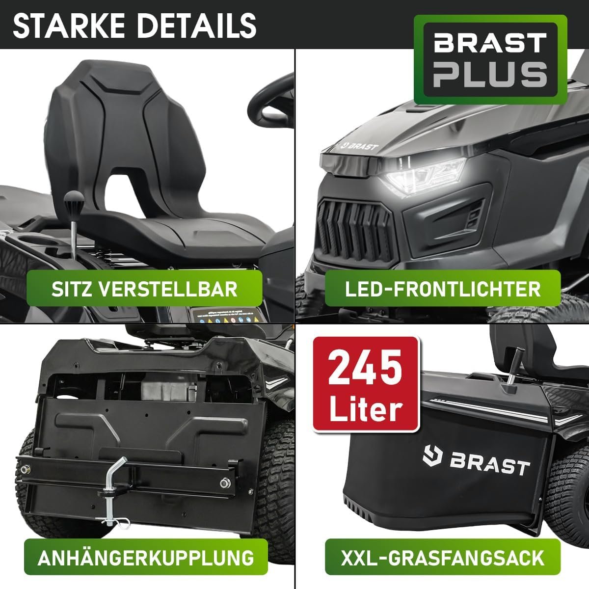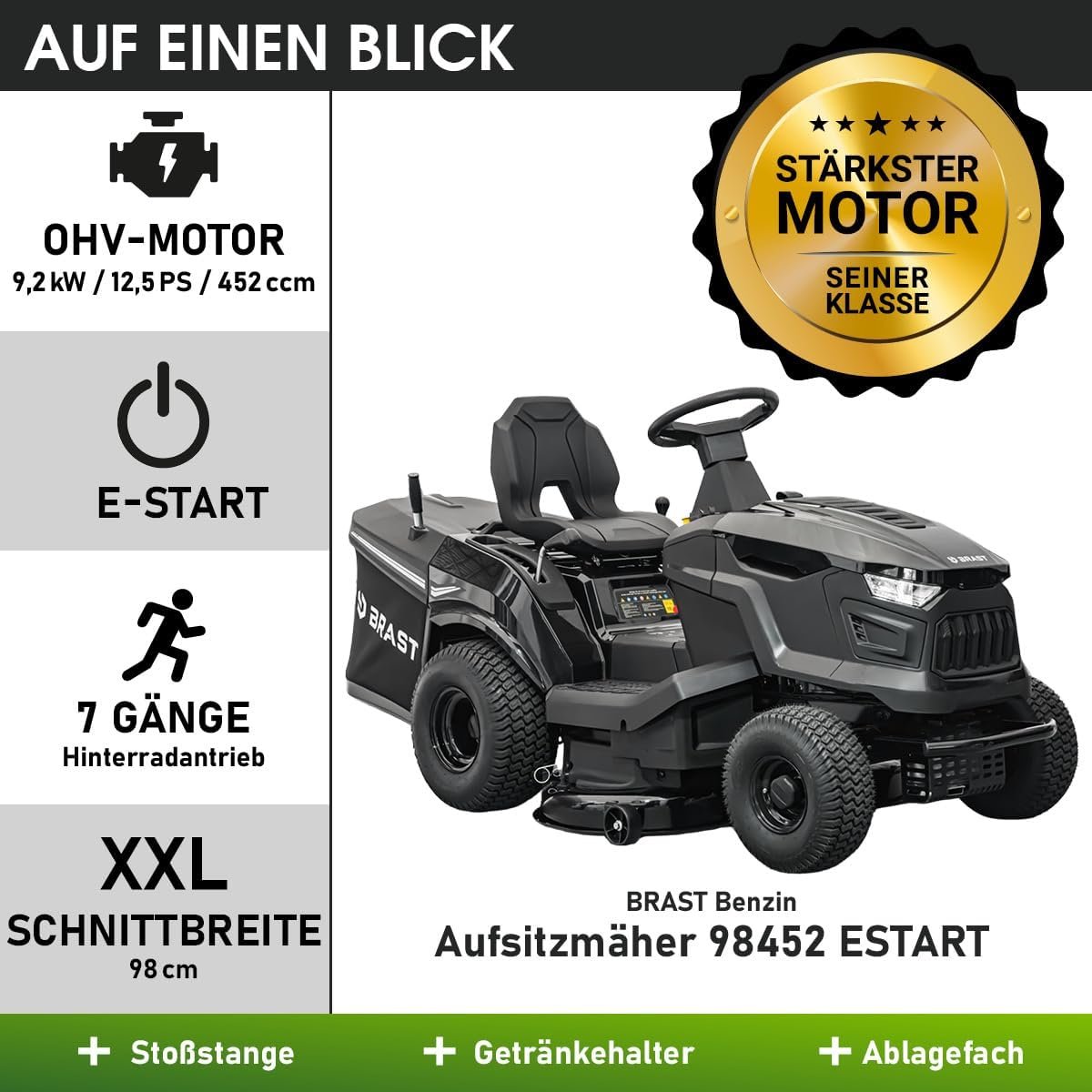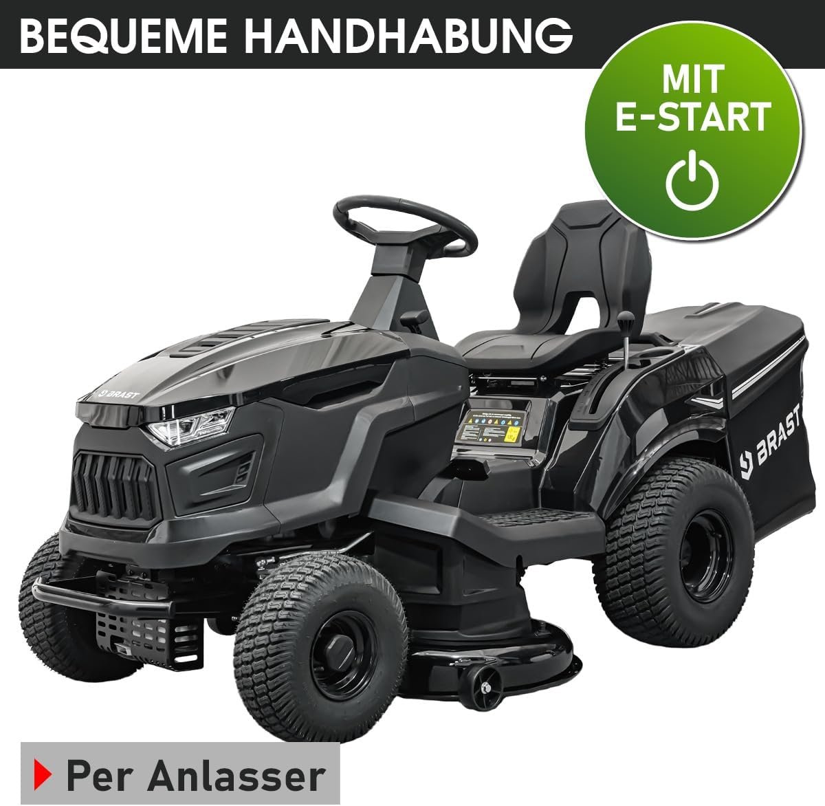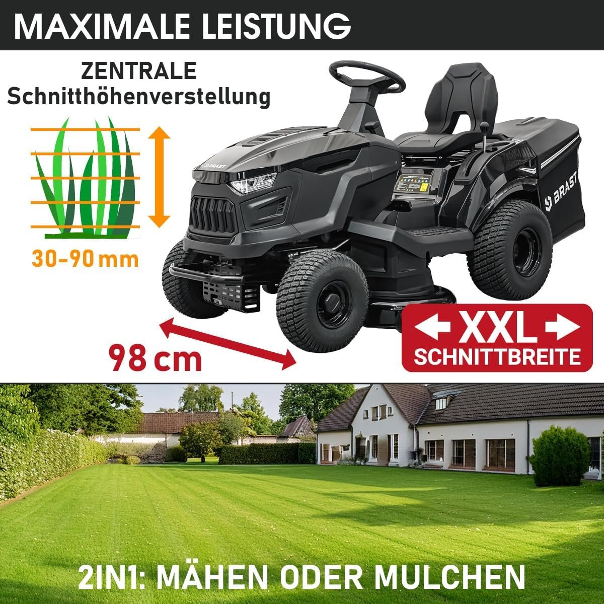 BRAST Benzin Rasentraktor Aufsitzmäher | 9,2 kW (12,5 PS) | Elektrostart | XXL Schnittbreite 98cm | 2in1-Funktion | 7-Gang-Getriebe | 245L Fangkorb | für große Rasenflächen 1.000-5.000 m²BRAST Rasentraktor 12,5 PS | 98 cm XXL-Schnittbreite | 245L | Für 1.000-5.000 m²