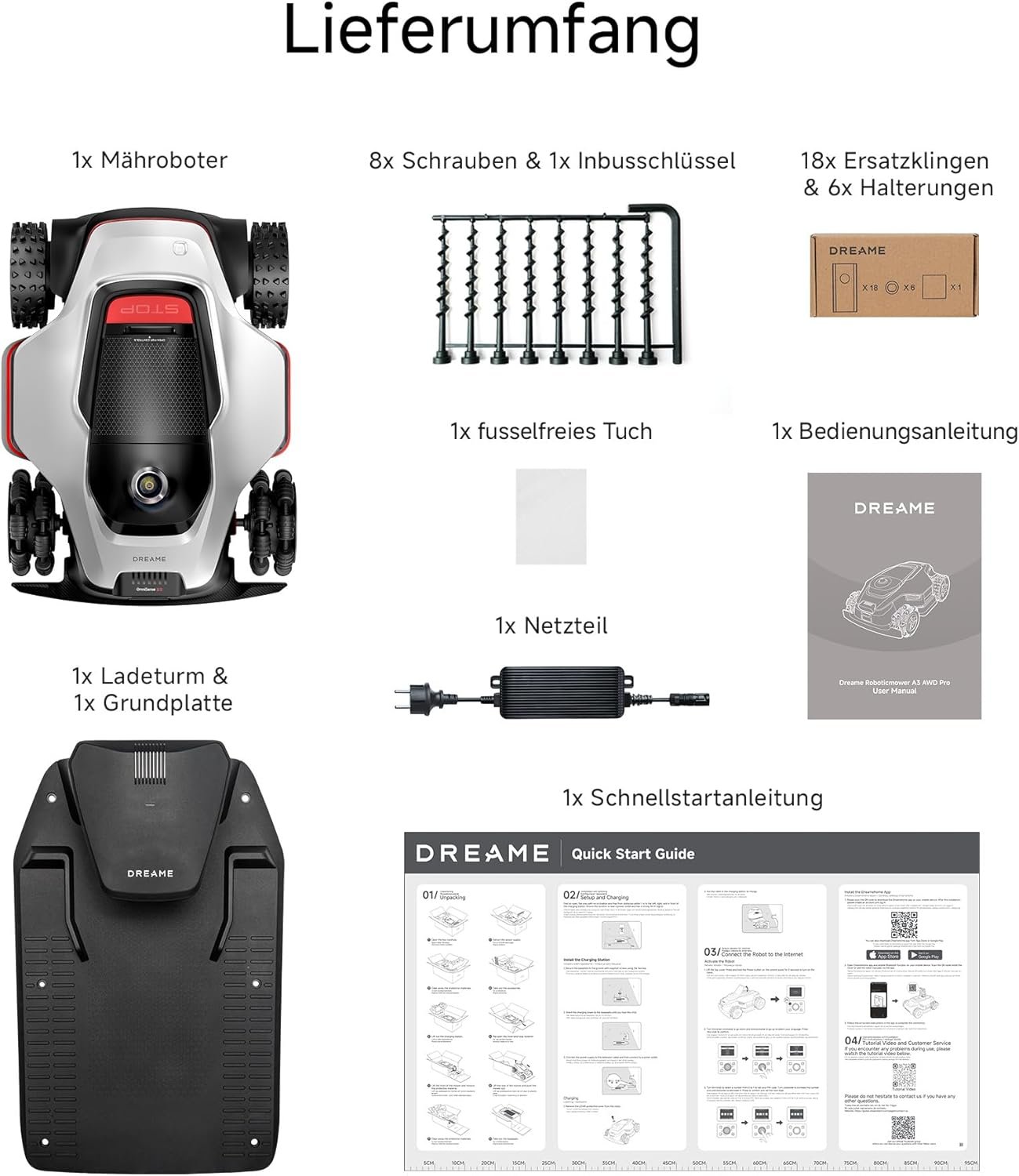 Der DREAME A3 AWD Pro 3500 setzt neue Maßstäbe für autonome Großflächen-Rasenpflege. 4WD-Allradantrieb, 360° 3D-LiDAR-Navigation, EdgeMaster 2.0 für <4 cm Kantengenauigkeit und 80% Steigfähigkeit machen ihn zur Premium-Lösung für anspruchsvolle Grundstücke bis 3.500 m².
