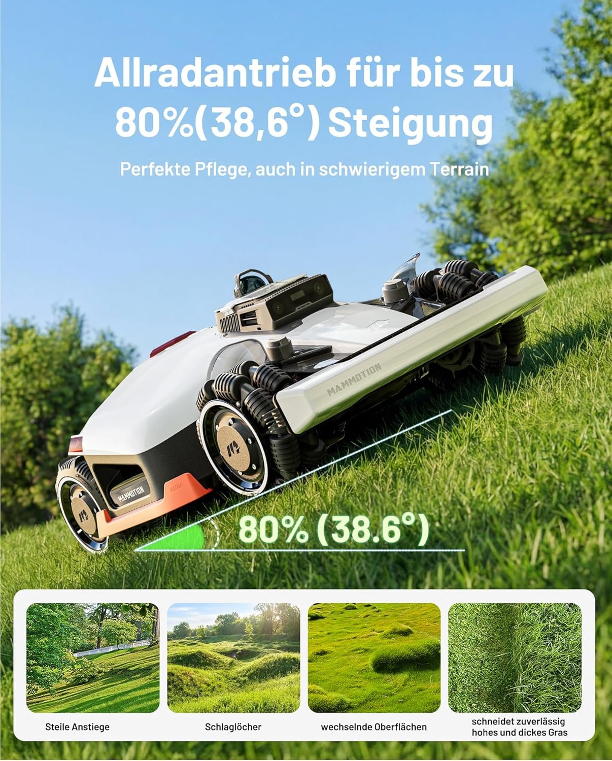Fläche: Bis 3.000 m² | Navigation: 360° LiDAR + NetRTK + KI-Vision | Akku: 12 Ah | Antrieb: AWD (Allrad) | Max. Steigung: 80%